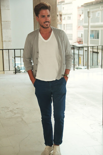 Esse inicio de semana como é que vos corre? Espero que bem. Com o Outono parece que regressou o bom tempo e ainda podemos utilizar as peças frescas. Para este outfit urbano de inicio de semana utilizei peças básicas que devemos ter no nossos guarda roupa, t-shirts lisas, cardigans , calças chino de diversas cores e no calçado os oxford renovados que continuam a ser um modelo intemporal.