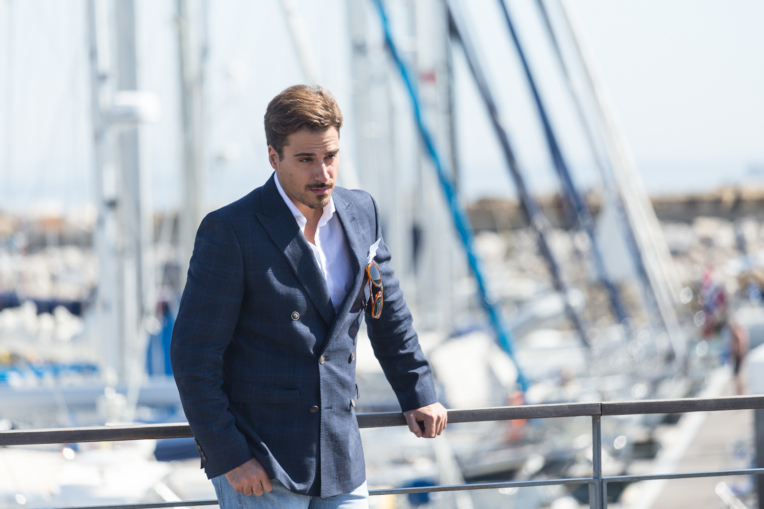 Como para mim os acessórios são essenciais; usei um relógio de forma rectangular da Maserati, um lenço no bolso branco e os óculos Persol desdobráveis que permitem uma fácil arrumação.